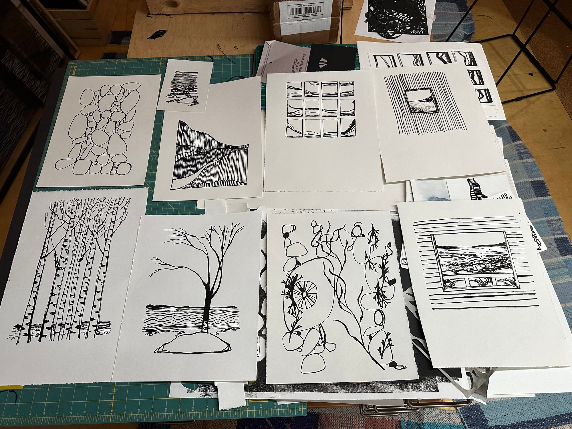 Every piece in this year’s calendar is an ink drawing. In a flattened, digital age, I wanted something that felt more textural, more tactile. A little more wild. Instead of grabbing a brush, or my usual blade, I went outside the studio and picked a dried stem of a bracken fern. This would be my tool. I dipped it in the ink jar and slowly began to make marks on the page, creating scenes and abstractions inspired by places and views that I love. Some real, some imaginary.