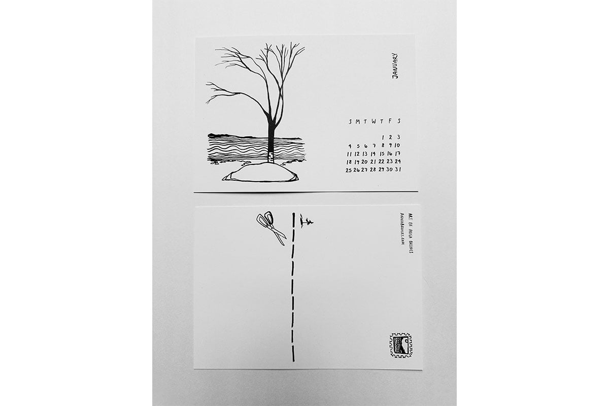 The calendars are loose, unbound, 7x5" sheets and printed on recycled paper in Seattle, Washington. Once cut, postcards are about 4x5".