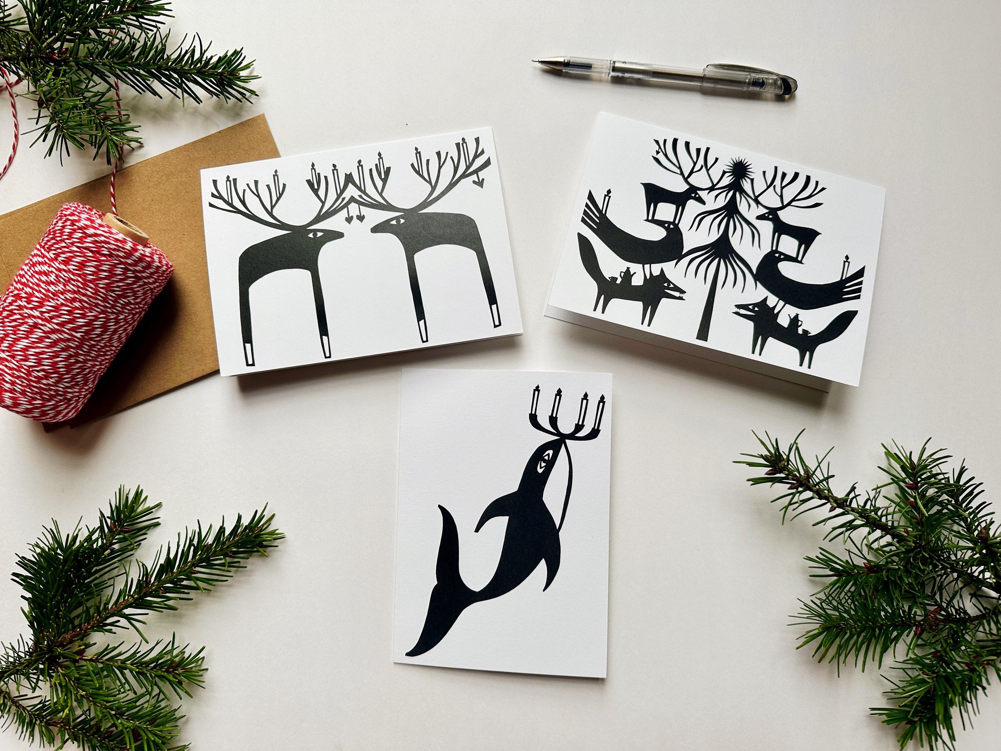 Each set features 3 different cards. Cards are 4.5x6.25" greeting card featuring a print of an original papercut. Blank inside, and comes with a brown Kraft envelope.