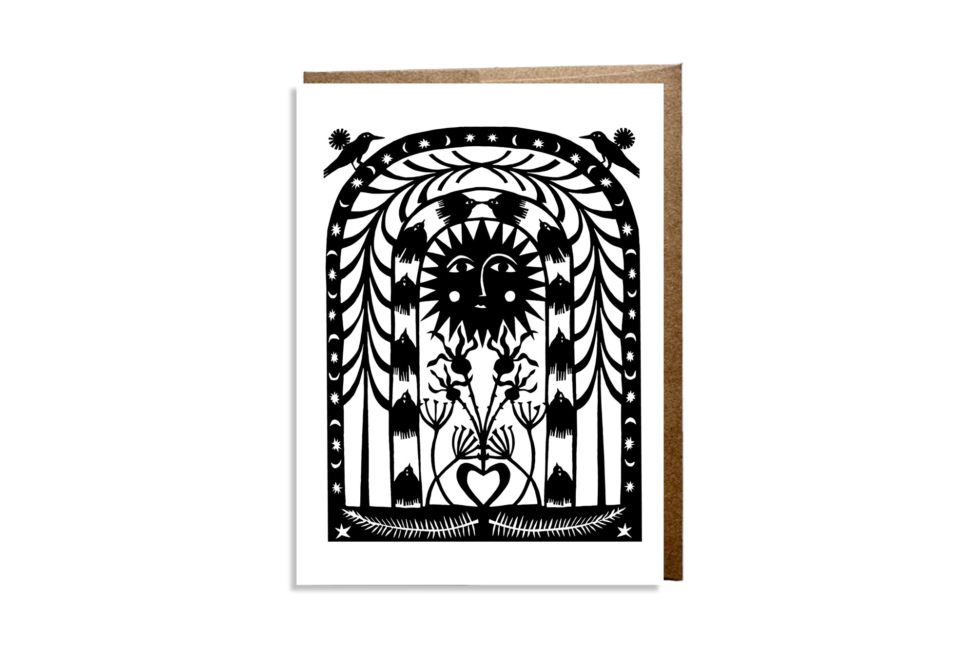 4.5x6.25" greeting card featuring a print of an original papercut. Printed on 100% recycled paper, blank inside, and comes with a brown Kraft envelope.